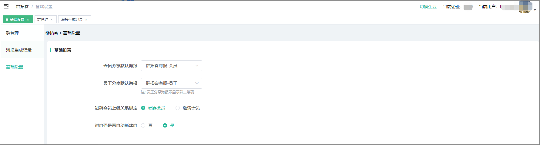2、后台--应用--群拓客如果开启后只有企业管理平台--基础设置中和平台绑定的企业可以使用群拓客功能!