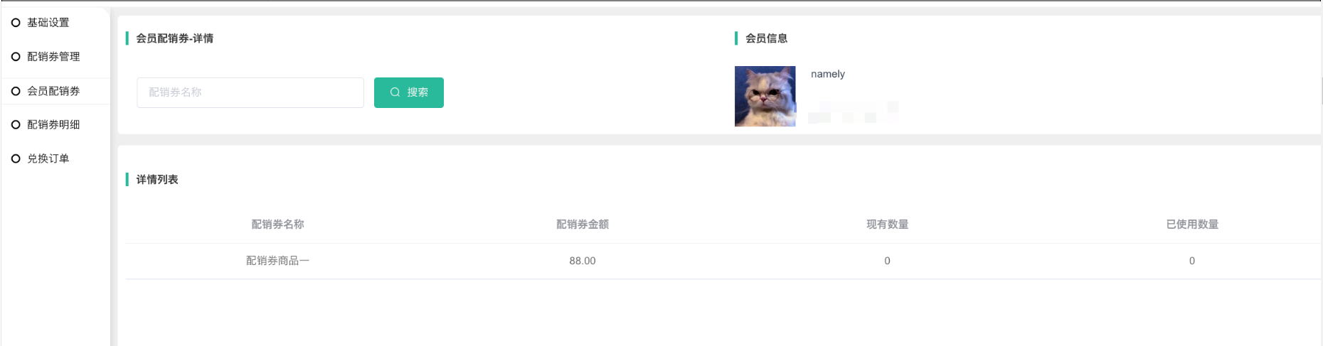 1、按照会员显示配销券。配销券总量包含过期的配销券。会员购买商品获得配销券,或者是后台手动发放,会员配销券列表会有相关显示。