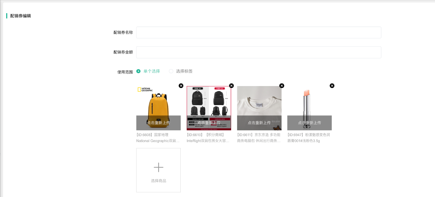 1、后台添加配销券,设置配销券金额、使用规则(每月只能使用1张,或者可一次性使用多张),选择购买指定商品赠送相应配销券.