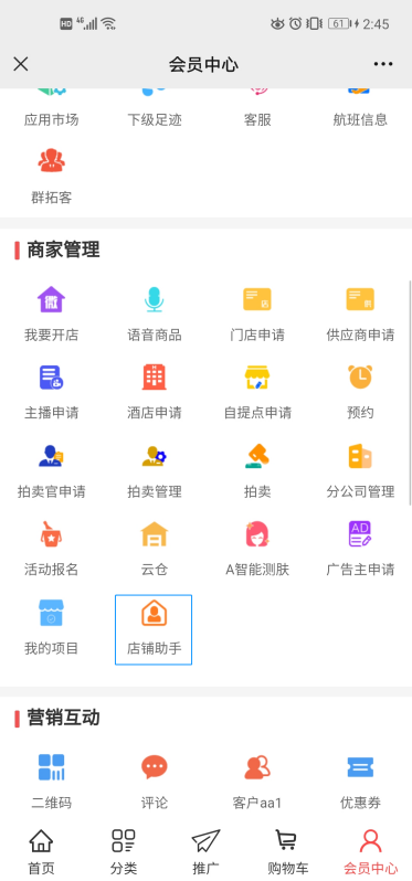 会员被添加为店铺助手管理员后,可在前端管理商城的商品、订单、会员、财务等。