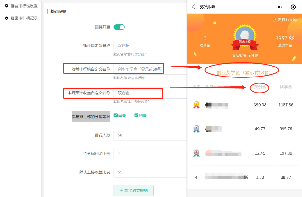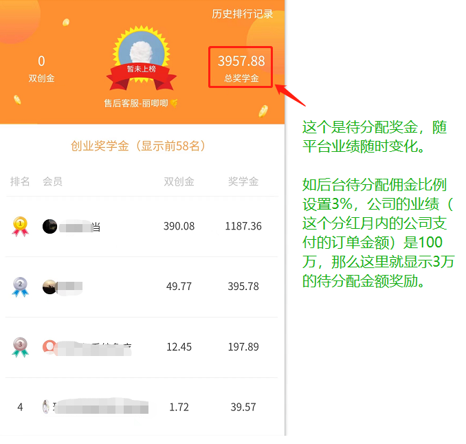 每一名设置获得上榜奖金,上榜奖金为总分配金额的X%,订单退单进行减少,实时变化,没有设置个人上榜奖金的其他人,走默认上榜收益比例平分X%