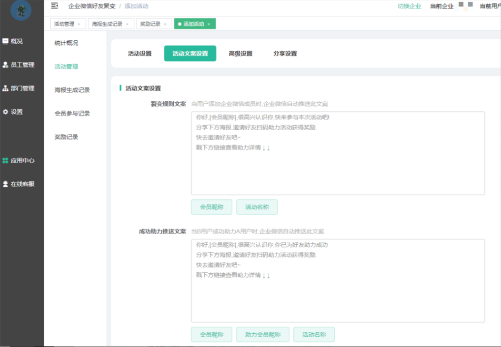 裂变成员:指定生成活动海报时对应的企业微信成员,如果选择多个,自动生成海报时,选中的成员顺序为: