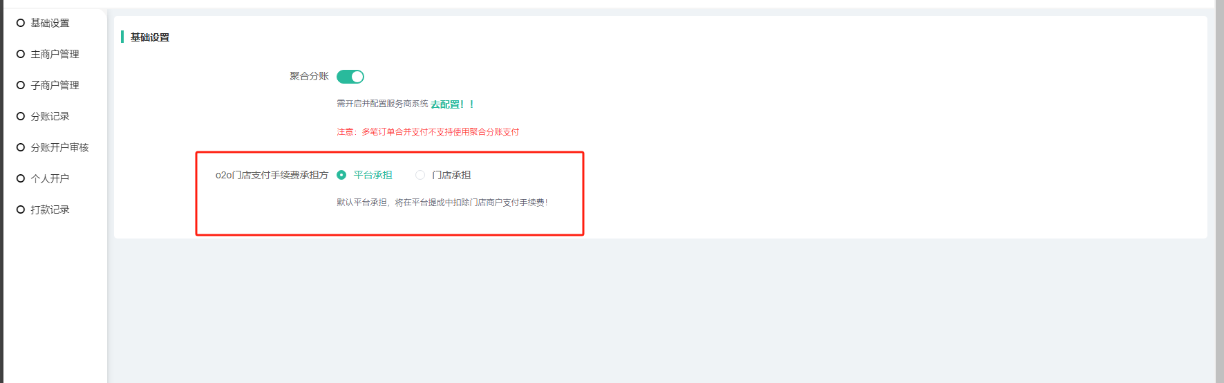 如果商城门店使用分账功能,联系客服配置好数据通系统信息和聚合支付信息,再去开启聚合支付分账。