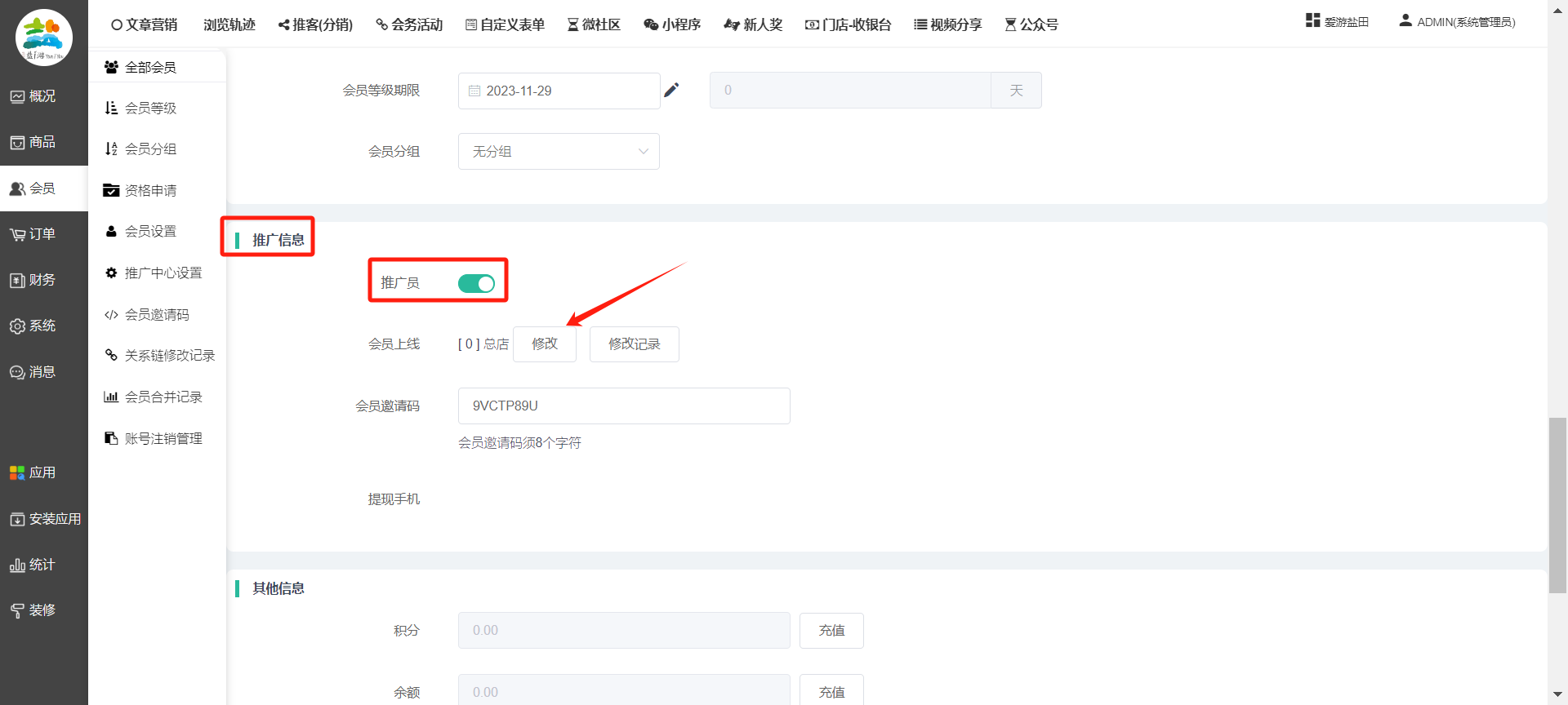 目录 搜索 展开 一、前期准备资料二、数字乡村码-上线操作指南1、服务号的申请流程及认证2、申请小程序流程3、开放平台绑定小程序和公众号三、数字乡村码-系统操作数字乡村码系统管理-概况数字乡村码-商品管理1、发布商品2、商品列表3、商品表单4、商品分类5、品牌管理6、配送模板7、评论管理8、优惠券管理9、商品标签10、退货地址设置11、满额优惠12、批量操作13、配送方式14、基础设置15、商品隐藏四、数字乡村码-会员管理1、全部会员2、会员等级3、会员分组4、资格申请5、会员设置6、推广中心设置7、会员邀请码8、会员关系链修改关系链修改记录9、会员合并记录10、账号注销管理11、会员设置中心五、数字乡村码-订单管理1、订单管理列表2、订单处理流程3、订单状态4、订单修改价格5、订单退款退货6、多包裹发货7、批量发货订单操作步骤8、催发货订单9、物流查询六、数字乡村码-财务管理1、余额设置2、会员余额3、充值记录4、转让记录5、余额明细6、收入明细7、提现设置8、提现统计9、积分管理10、转账审核11、收益广告12、批量充值七、数字乡村码-系统管理1、商城入口2、商城设置①、商城设置②、订单设置③、物流查询④、短信⑤、联系方式⑥、分类⑦、优惠券⑧、分享⑨、幻灯片⑩、广告位⑫、地图设置3、交易设置4、微信模板消息自定义消息模板(新版)自定义消息模板(旧版)小程序消息模板公众号模板消息变更公告5、语言设置6、权限管理7、多媒体管理八、数字乡村码-消息管理九、数字乡村码-应用管理十、数字乡村码系统-数据统计十一、数字乡村码-页面装修DIY1、模板管理2、店铺页面3、顶部导航4、底部导航5、DIY模板市场6、首屏广告7、基础设置8、装修DIY尺寸建议十二、供应商功能插件操作指南1、供应商2、门店-收银台门店申请和使用步骤门店管理①、门店-收银台 营销设置②、门店-收银台 分润设置门店分类门店申请门店审核门店商品门店商品订单收银台订单数据统计核销员基础设置默认设置门店装修3、微社区4、会务活动十三、营销插件操作指南活动报名提货卡新人奖微店问卷调查积分视频分享1、视频分享基础设置2、视频分享发现管理3、视频分享分类管理4、视频分享评论管理5、视频分享分红记录6、视频分享短视频中心每日红包幸运大抽奖签到优惠券二维码任务奖励优惠劵文章音频文章付费文章限时购新海报拓客卡操作流程积分活动素材中心视频红包十四、入驻门店应用类1、门店预约2、附近商品3、门店定位设置4、门店控制5、门店满额包邮6、门店满额减7、导入商品8、门店搜索9、门店股东10、核销券11、多门店核销1、商城后台设置2、前端功能演示十五、常见问题1、后台登录密码修改流程2、会员-余额,积分,后台如何进行充值与扣除3、如何修改上下级关系4、一种万能的获取商城小程序路径的方法 暂无相关搜索结果! 阅读次数:1954 本文档使用 模王系统 发布 8、会员关系链修改 8、会员关系链修改一.如何修改上下级关系?1.会员-全部会员-可以通过搜索用户的独立ID,或者用户微信昵称,找到此会员,然后点击右边的(操作)2.再点击会员详情。3.滑到下面,有个推广信息-会员上线,点击修改4.输入上级的ID号,点击搜索,出来此上级会员后点击选择。5.滑到最下面,一定要点击提交按钮。文档更新时间: 2023-11-30 14:56 作者:链上旅行