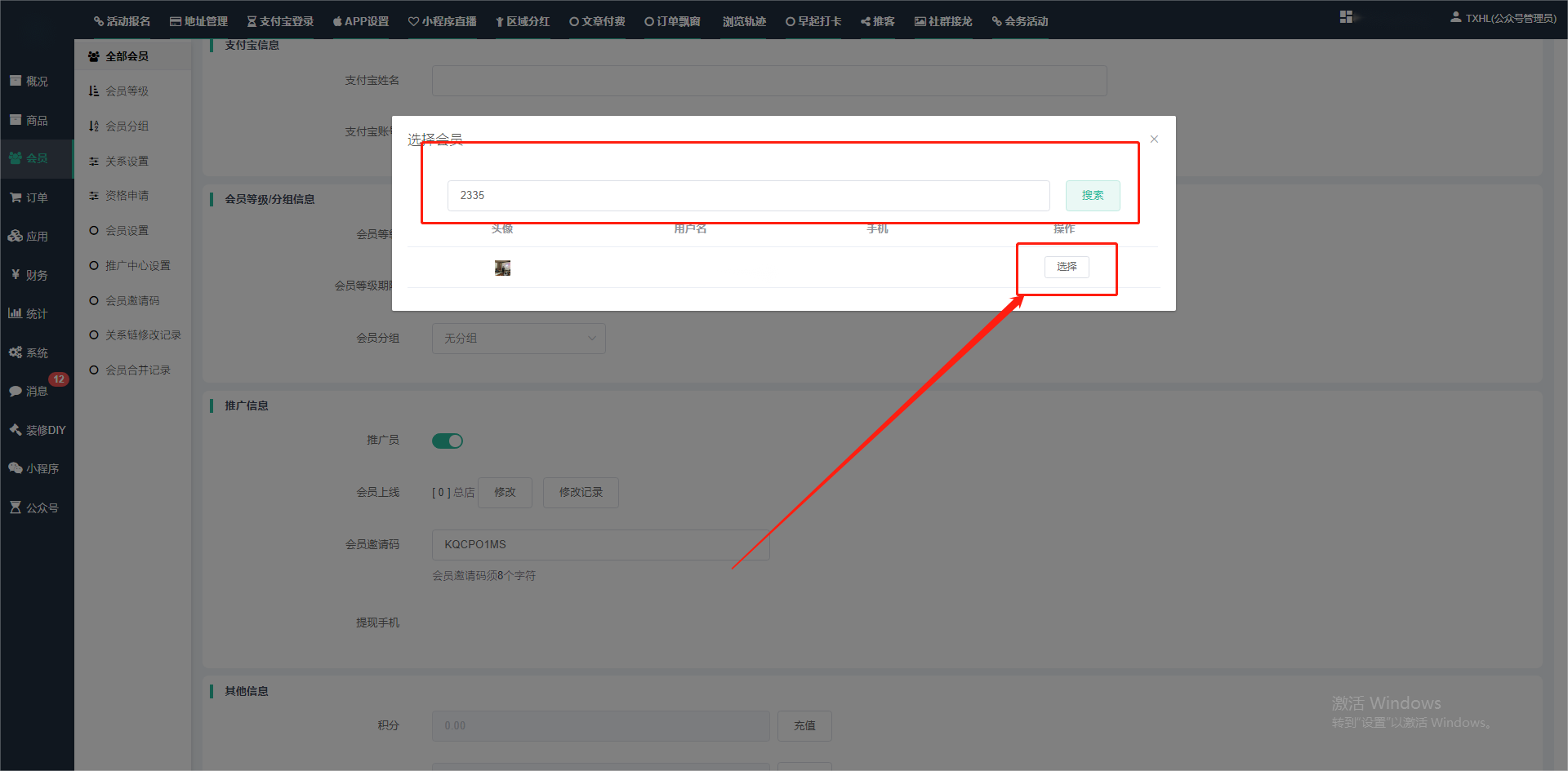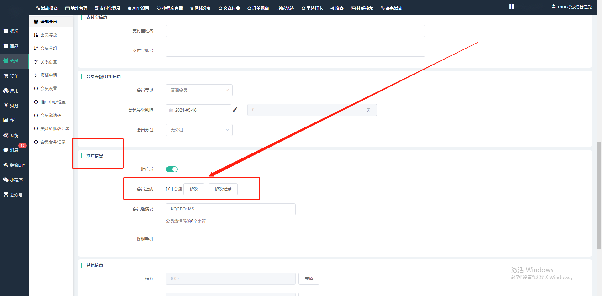 目录 搜索 展开 一、前期准备资料二、数字乡村码-上线操作指南1、服务号的申请流程及认证2、申请小程序流程3、开放平台绑定小程序和公众号三、数字乡村码-系统操作数字乡村码系统管理-概况数字乡村码-商品管理1、发布商品2、商品列表3、商品表单4、商品分类5、品牌管理6、配送模板7、评论管理8、优惠券管理9、商品标签10、退货地址设置11、满额优惠12、批量操作13、配送方式14、基础设置15、商品隐藏四、数字乡村码-会员管理1、全部会员2、会员等级3、会员分组4、资格申请5、会员设置6、推广中心设置7、会员邀请码8、会员关系链修改关系链修改记录9、会员合并记录10、账号注销管理11、会员设置中心五、数字乡村码-订单管理1、订单管理列表2、订单处理流程3、订单状态4、订单修改价格5、订单退款退货6、多包裹发货7、批量发货订单操作步骤8、催发货订单9、物流查询六、数字乡村码-财务管理1、余额设置2、会员余额3、充值记录4、转让记录5、余额明细6、收入明细7、提现设置8、提现统计9、积分管理10、转账审核11、收益广告12、批量充值七、数字乡村码-系统管理1、商城入口2、商城设置①、商城设置②、订单设置③、物流查询④、短信⑤、联系方式⑥、分类⑦、优惠券⑧、分享⑨、幻灯片⑩、广告位⑫、地图设置3、交易设置4、微信模板消息自定义消息模板(新版)自定义消息模板(旧版)小程序消息模板公众号模板消息变更公告5、语言设置6、权限管理7、多媒体管理八、数字乡村码-消息管理九、数字乡村码-应用管理十、数字乡村码系统-数据统计十一、数字乡村码-页面装修DIY1、模板管理2、店铺页面3、顶部导航4、底部导航5、DIY模板市场6、首屏广告7、基础设置8、装修DIY尺寸建议十二、供应商功能插件操作指南1、供应商2、门店-收银台门店申请和使用步骤门店管理①、门店-收银台 营销设置②、门店-收银台 分润设置门店分类门店申请门店审核门店商品门店商品订单收银台订单数据统计核销员基础设置默认设置门店装修3、微社区4、会务活动十三、营销插件操作指南活动报名提货卡新人奖微店问卷调查积分视频分享1、视频分享基础设置2、视频分享发现管理3、视频分享分类管理4、视频分享评论管理5、视频分享分红记录6、视频分享短视频中心每日红包幸运大抽奖签到优惠券二维码任务奖励优惠劵文章音频文章付费文章限时购新海报拓客卡操作流程积分活动素材中心视频红包十四、入驻门店应用类1、门店预约2、附近商品3、门店定位设置4、门店控制5、门店满额包邮6、门店满额减7、导入商品8、门店搜索9、门店股东10、核销券11、多门店核销1、商城后台设置2、前端功能演示十五、常见问题1、后台登录密码修改流程2、会员-余额,积分,后台如何进行充值与扣除3、如何修改上下级关系4、一种万能的获取商城小程序路径的方法 暂无相关搜索结果! 阅读次数:1516 本文档使用 模王系统 发布 3、如何修改上下级关系 如何修改上下级关系一.如何修改上下级关系?1.会员-全部会员-可以通过搜索用户的独立ID,或者用户微信昵称,找到此会员,然后点击右边的(操作)2.再点击会员详情。3.滑到下面,有个推广信息-会员上线,点击修改4.输入上级的ID号,点击搜索,出来此上级会员后点击选择。5.滑到最下面,一定要点击提交按钮。文档更新时间: 2024-01-05 14:50 作者:链上旅行