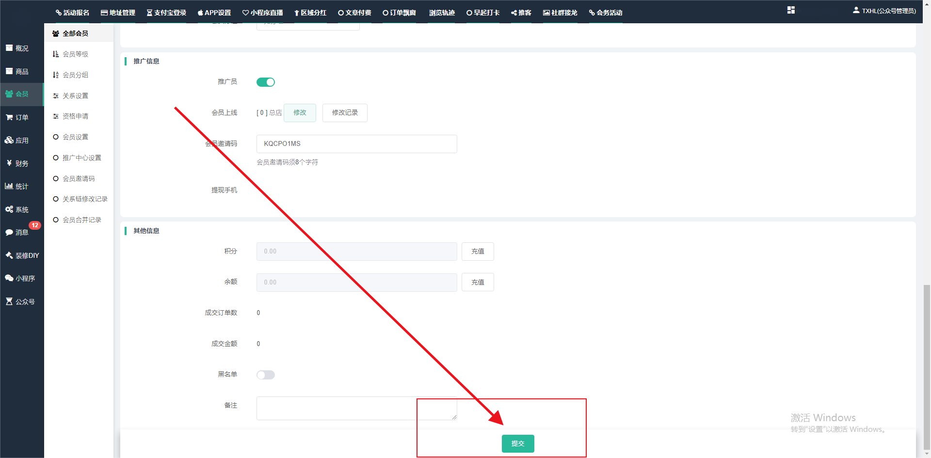 目录 搜索 展开 一、前期准备资料二、数字乡村码-上线操作指南1、服务号的申请流程及认证2、申请小程序流程3、开放平台绑定小程序和公众号三、数字乡村码-系统操作数字乡村码系统管理-概况数字乡村码-商品管理1、发布商品2、商品列表3、商品表单4、商品分类5、品牌管理6、配送模板7、评论管理8、优惠券管理9、商品标签10、退货地址设置11、满额优惠12、批量操作13、配送方式14、基础设置15、商品隐藏四、数字乡村码-会员管理1、全部会员2、会员等级3、会员分组4、资格申请5、会员设置6、推广中心设置7、会员邀请码8、会员关系链修改关系链修改记录9、会员合并记录10、账号注销管理11、会员设置中心五、数字乡村码-订单管理1、订单管理列表2、订单处理流程3、订单状态4、订单修改价格5、订单退款退货6、多包裹发货7、批量发货订单操作步骤8、催发货订单9、物流查询六、数字乡村码-财务管理1、余额设置2、会员余额3、充值记录4、转让记录5、余额明细6、收入明细7、提现设置8、提现统计9、积分管理10、转账审核11、收益广告12、批量充值七、数字乡村码-系统管理1、商城入口2、商城设置①、商城设置②、订单设置③、物流查询④、短信⑤、联系方式⑥、分类⑦、优惠券⑧、分享⑨、幻灯片⑩、广告位⑫、地图设置3、交易设置4、微信模板消息自定义消息模板(新版)自定义消息模板(旧版)小程序消息模板公众号模板消息变更公告5、语言设置6、权限管理7、多媒体管理八、数字乡村码-消息管理九、数字乡村码-应用管理十、数字乡村码系统-数据统计十一、数字乡村码-页面装修DIY1、模板管理2、店铺页面3、顶部导航4、底部导航5、DIY模板市场6、首屏广告7、基础设置8、装修DIY尺寸建议十二、供应商功能插件操作指南1、供应商2、门店-收银台门店申请和使用步骤门店管理①、门店-收银台 营销设置②、门店-收银台 分润设置门店分类门店申请门店审核门店商品门店商品订单收银台订单数据统计核销员基础设置默认设置门店装修3、微社区4、会务活动十三、营销插件操作指南活动报名提货卡新人奖微店问卷调查积分视频分享1、视频分享基础设置2、视频分享发现管理3、视频分享分类管理4、视频分享评论管理5、视频分享分红记录6、视频分享短视频中心每日红包幸运大抽奖签到优惠券二维码任务奖励优惠劵文章音频文章付费文章限时购新海报拓客卡操作流程积分活动素材中心视频红包十四、入驻门店应用类1、门店预约2、附近商品3、门店定位设置4、门店控制5、门店满额包邮6、门店满额减7、导入商品8、门店搜索9、门店股东10、核销券11、多门店核销1、商城后台设置2、前端功能演示十五、常见问题1、后台登录密码修改流程2、会员-余额,积分,后台如何进行充值与扣除3、如何修改上下级关系4、一种万能的获取商城小程序路径的方法 暂无相关搜索结果! 阅读次数:1531 本文档使用 模王系统 发布 3、如何修改上下级关系 如何修改上下级关系一.如何修改上下级关系?1.会员-全部会员-可以通过搜索用户的独立ID,或者用户微信昵称,找到此会员,然后点击右边的(操作)2.再点击会员详情。3.滑到下面,有个推广信息-会员上线,点击修改4.输入上级的ID号,点击搜索,出来此上级会员后点击选择。5.滑到最下面,一定要点击提交按钮。文档更新时间: 2024-01-05 14:50 作者:链上旅行